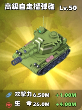 ![]() | Lv50(高級自走榴弾砲) | 6,500,000(6.50M) | 26,000,000(26.0M) |